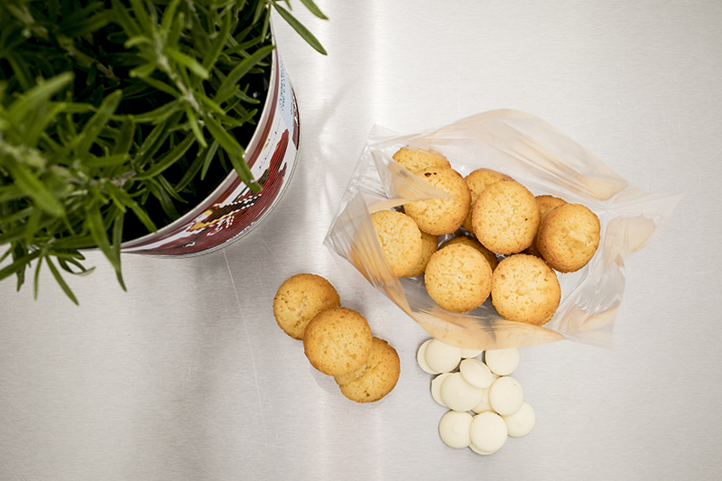 Chocolate blanco, harina, huevo, mantequilla, azúcar.
